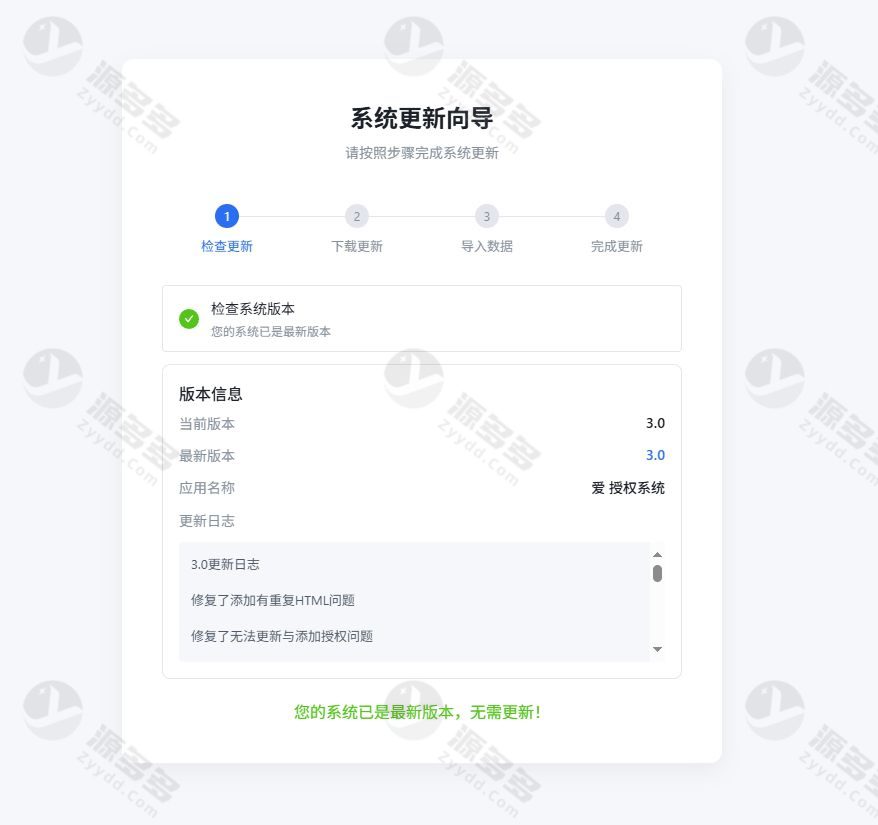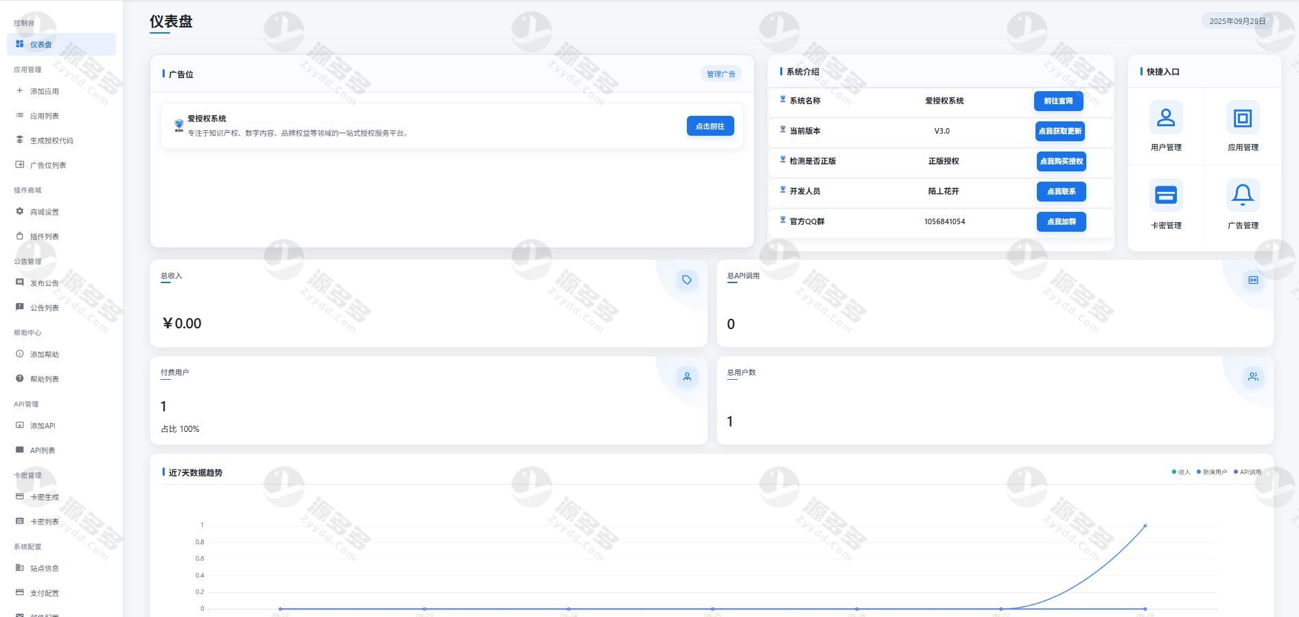 爱授权系统V3.0是一款功能完善的多应用授权管理平台,已去除官方授权验证,可直接部署使用。系统采用SG15加密方案,适用于宝塔环境下的快速安装部署。内置远程广告API与插件商城API接口,开发者可在自有源码中灵活调用,实现远程配置与插件扩展等功能。该版本稳定高效,适合需要多应用授权验证及集中管理的站长或开发团队使用。请勿执行在线更新,以免影响正常使用。