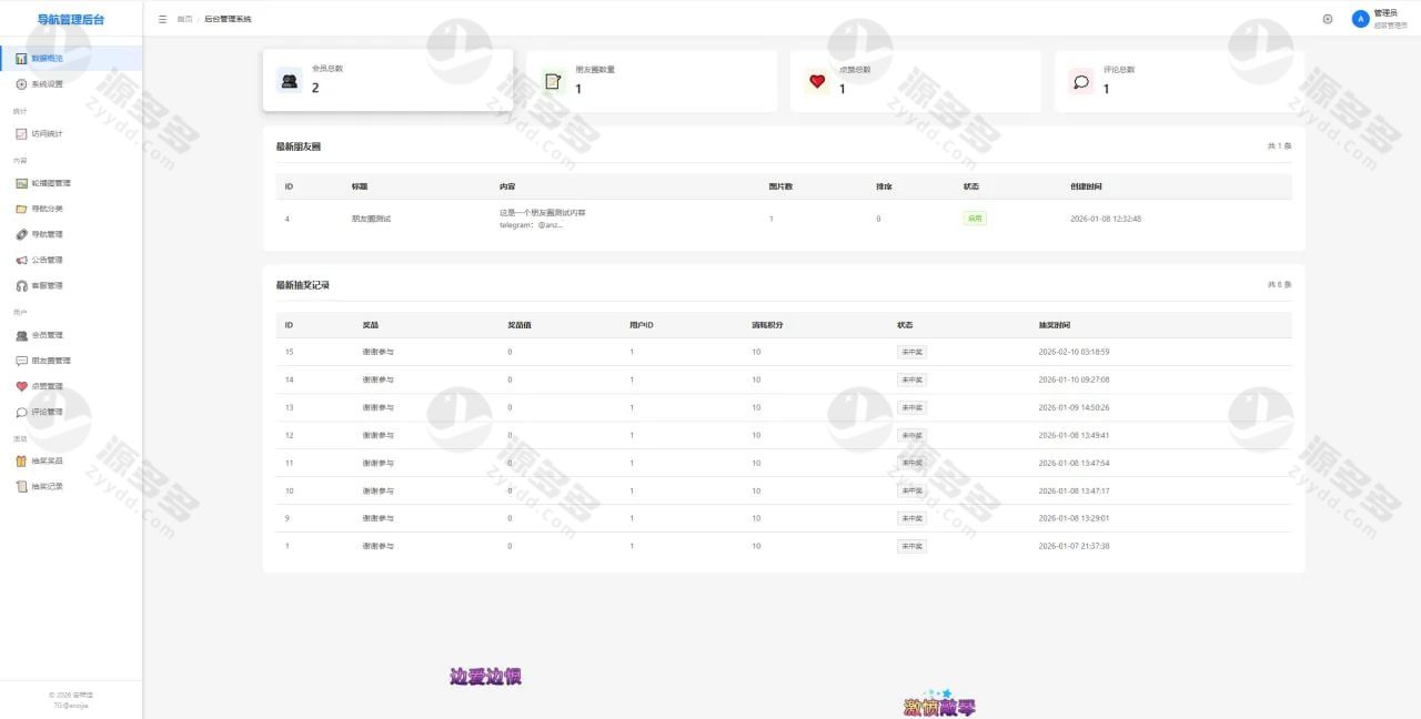 本资源为一套基于 PHP + MySQL 开发的导航类网站系统源码,内置抽奖功能模块,整体结构清晰,功能模块划分合理,适用于个人站长搭建网址导航平台或在此基础上进行功能扩展与二次开发。系统支持常规服务器环境部署,具备良好的兼容性与可维护性。