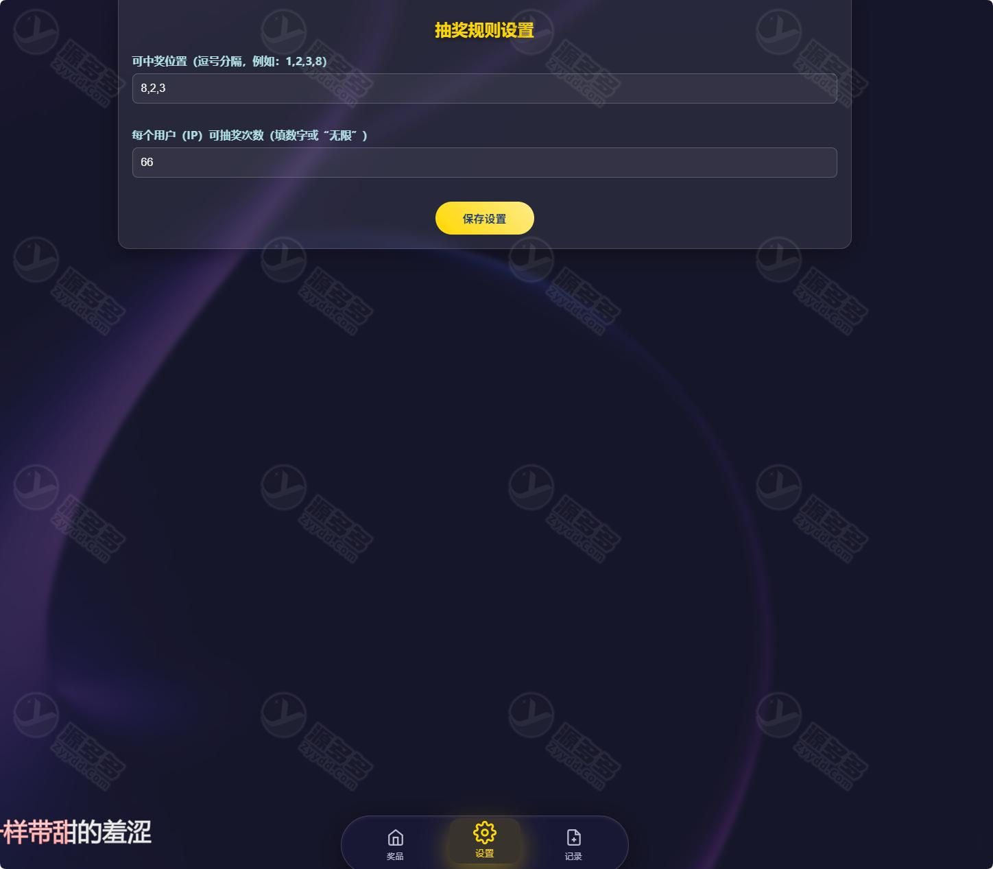 万象好礼九宫格抽奖系统是一款面向节日促销与线上活动场景开发的互动抽奖程序,整体基于宝塔面板环境运行,采用 PHP 与 MySQL 构建后端逻辑,适用于各类营销推广页面快速搭建。系统采用九宫格抽奖布局设计,结合平滑的循环动画效果,实现由加速到减速的过渡过程,增强视觉表现力与参与体验。后台支持自定义奖品图片上传、奖品展示位置调整及中奖概率配置,可根据活动需求灵活控制奖项分布。系统内置 IP 抽奖次数限制功能,管理员可在后台设置单次、限定次数或不限次数模式,有效控制活动参与规则。前端界面采用毛玻璃风格设计,兼容主流浏览器并适配手机端显示,确保移动设备访问流畅稳定。后台管理模块支持奖品信息编辑、中奖位置设置以及中奖记录查询,便于活动数据统计与管理。整体部署流程简单,适合节庆活动、周年庆、线上促销及品牌推广等场景使用,具备较好的扩展性与二次开发空间。